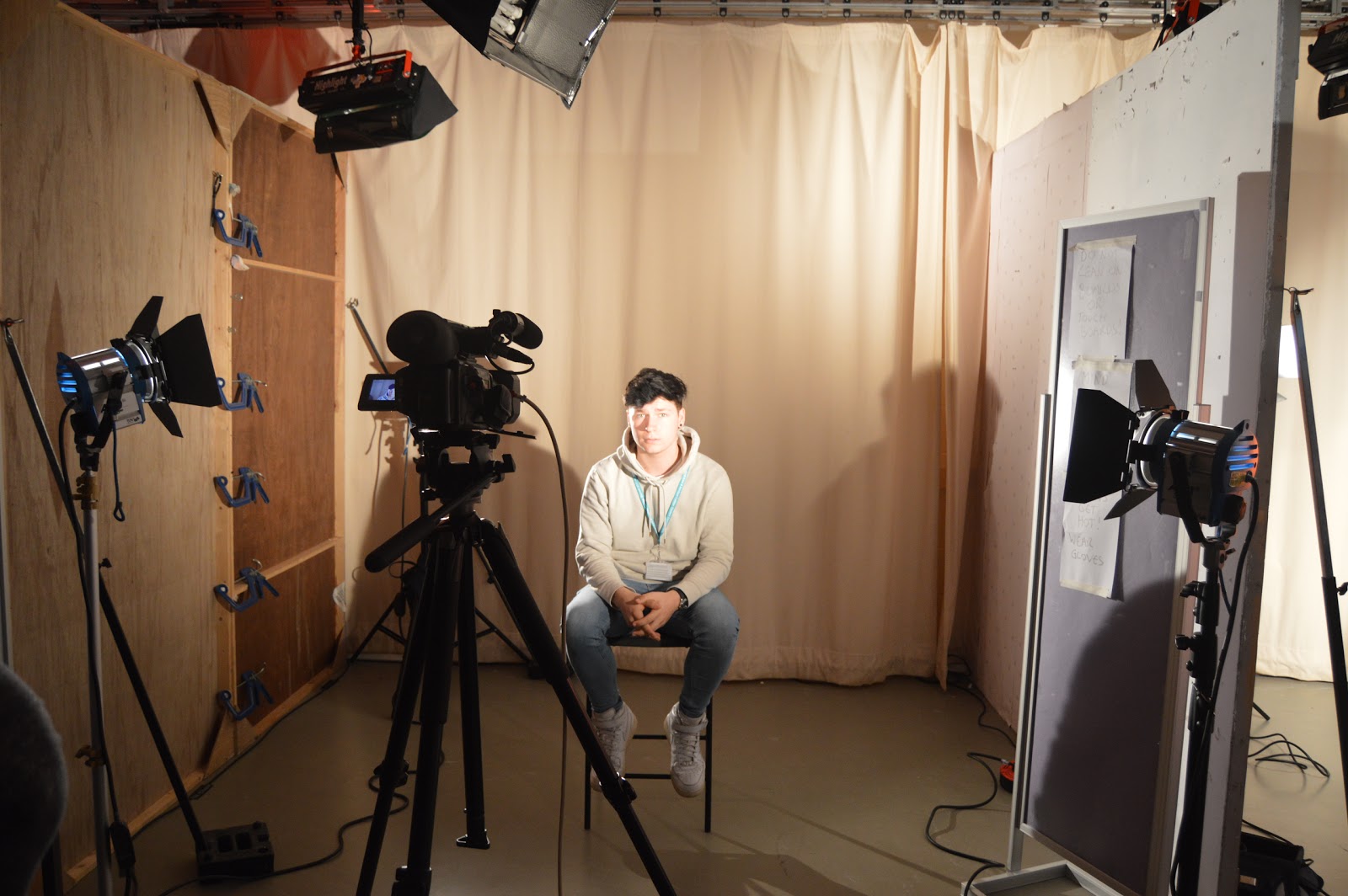 In the first setup we used the 3 Arri 300W to combine a total output of 900W. The lights have a medium brightness with a very wide or narrow coverage and easy to use but need gloves and sandbags as they get warm.